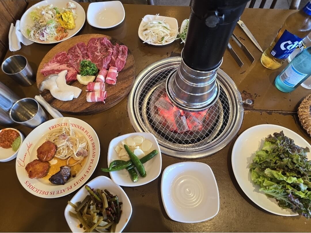 소고기 무한 리필 또는 돼지 고기 무한 리필을 시키면 1 인당 셀프바는 무료 고기는 무한 리필이 됩니다. 그리고, 라면도 셀프로 조리가 가능 합니다. 점심 저녁이 가격이 다르므로 확인 하시기 바랍니다.