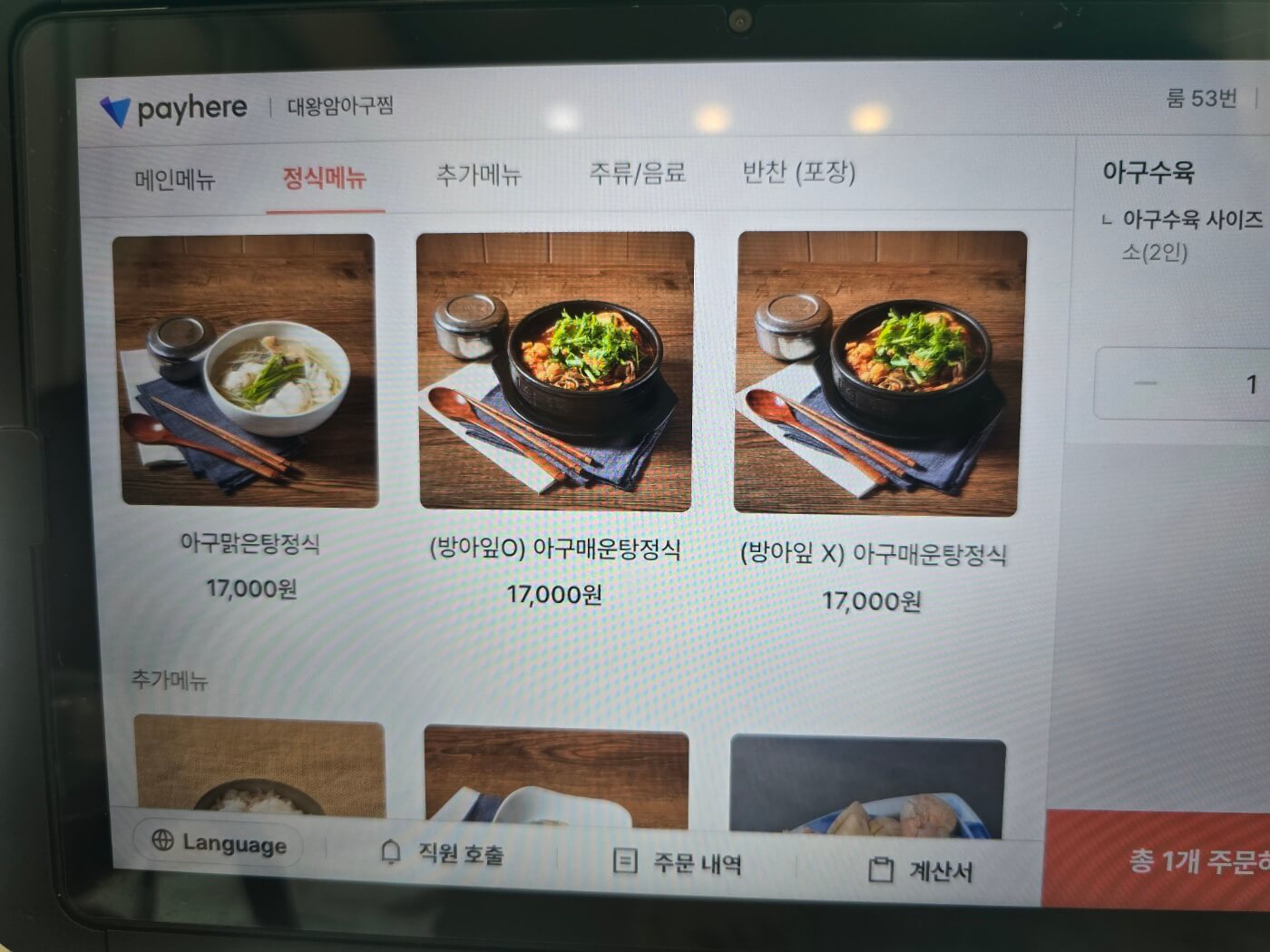 메뉴는 테이블에 놓인 태블릿으로 편하게 주문할 수 있었습니다. 메인 메뉴부터 정식, 추가 메뉴까지 다양한 아귀 요리가 가득해서 행복한 고민 끝에 이 집의 시그니처 메뉴인 '아구수육'을 주문했어요. 활아귀 전문점이라 그런지, 뽀얗고 큼직한 아귀 수육이 푸짐하게 담겨 나온 모습에 감탄이 절로 나왔습니다.