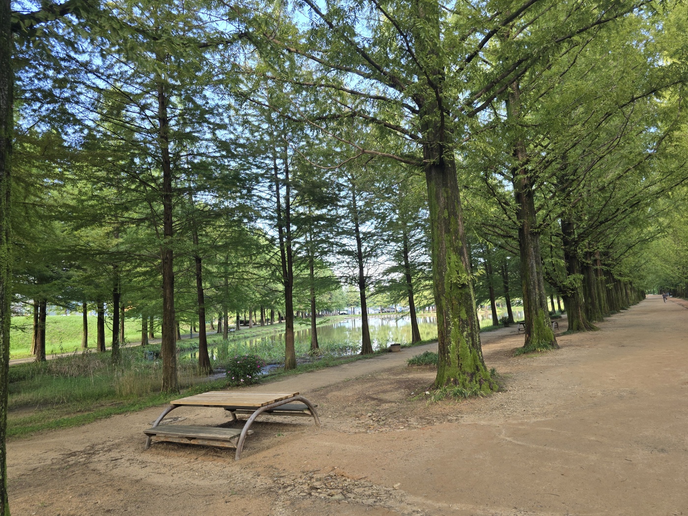 친구와 함께 죽녹원에서 청량한 대나무 기운을 만끽한 후, 저희는 곧바로 담양의 또 다른 상징인 **메타세쿼이아랜드**로 향했어요. 오후 햇살이 강했지만, 이곳의 거대한 나무 그늘 덕분에 한층 시원한 기분을 느낄 수 있었죠. 제가 기대했던 건 멋진 인증샷뿐만이 아니었답니다. 바로 요즘 대세인 **'맨발걷기'** 체험이었거든요. 😊