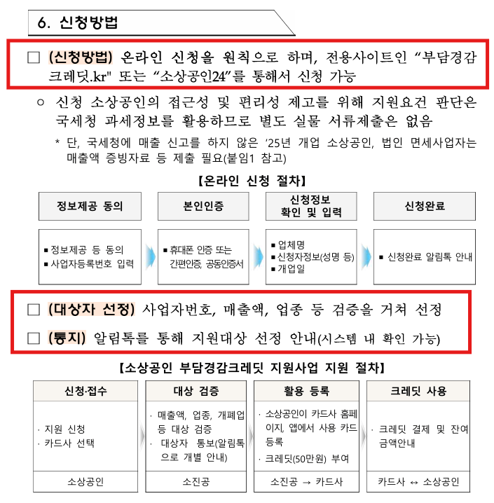 6. 신청 방법 : " 부담경감 크레딧. kr 또는 소상공인 24를 통해 신청가능