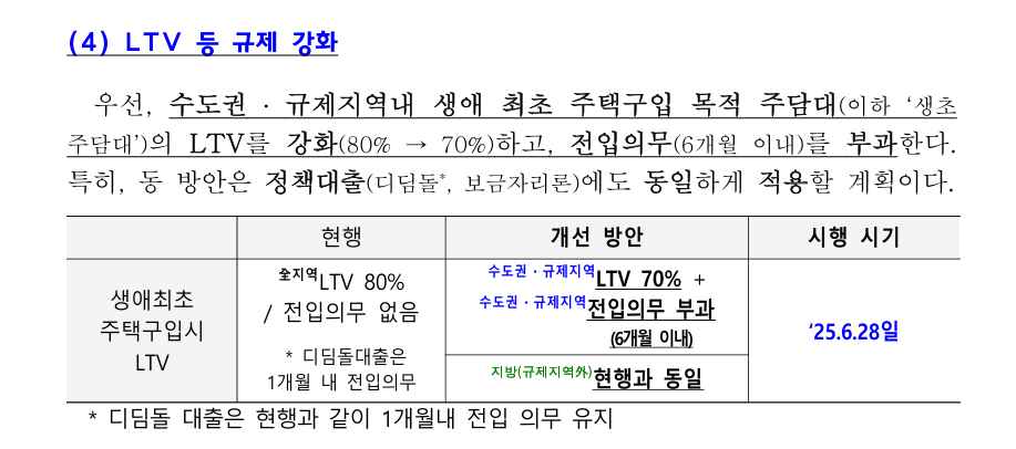 생애 최초 혜택도 축소되었습니다. 기존 LTV 80% 에서 70 %로 축소 됐고, 6 개월이내 전입의무가 부과되었습니다.